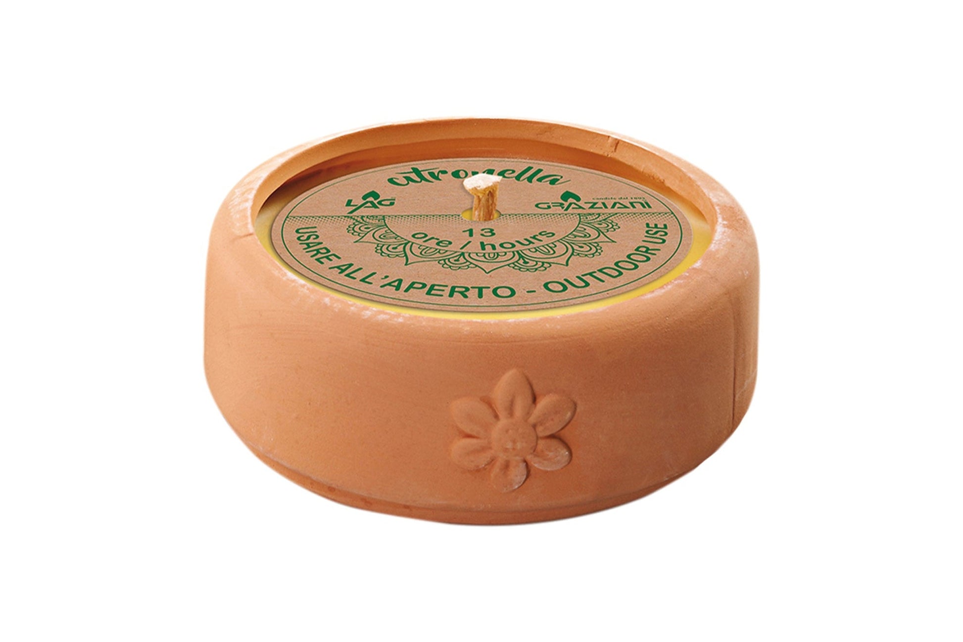 Oggetto che arreda, profuma e protegge: questa elegante candela da esterno in vero cotto toscano decorato, ha uno stoppino spesso in cotone egiziano per assicurare una fiamma ampia e resistente al vento.